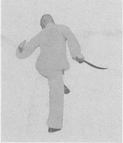 此势共有四张刀照,先师摄有两张。缺第一张抬腿起跳和 第三张腾空旋转的动作,现补上。第二张是落步欲转身的动作, 第四张是跳跃旋转后提刀藏于右腰侧,左掌前伸、扭头回顾的 动作。刀照气势雄壮,十分传神。先师传授此势的练法是: