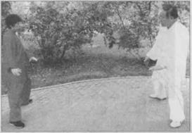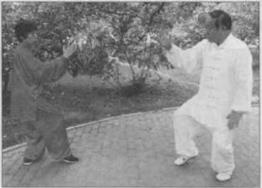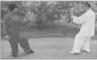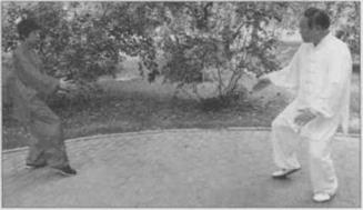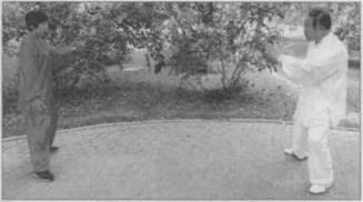 甲乙双方同时右脚提起向右前45度方向上一步左脚提起迅速跟至右踝内侧脚尖着地。同时右手前运甲乙两手背相贴成顺步右式单搭手式左手弧形运至左胯外侧掌心朝裤缝掌指朝下。眼神仍关注对方平视。(图5-301)