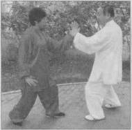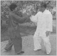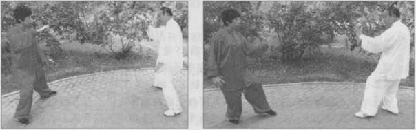 图5-299图5-299图5-300图5-300005-301005-301图5-302图5-302图5-303图5-303图5-304图5-304动作五甲乙双方同时提起右脚向右方向跨一步左脚提起迅速跟至右踝内侧脚尖着地。同时右手弧形运至右肩前方对左掌形成包揽然后弧形运至右胯外侧掌指朝下掌心朝裤缝左掌向右向上运动做裤内旋、臂外旋经右小臂内侧弧形向前上方向穿出掌指高与肩平掌心朝右下。眼神通过左掌指尖关注对方平视。(图5-303、图5-304)