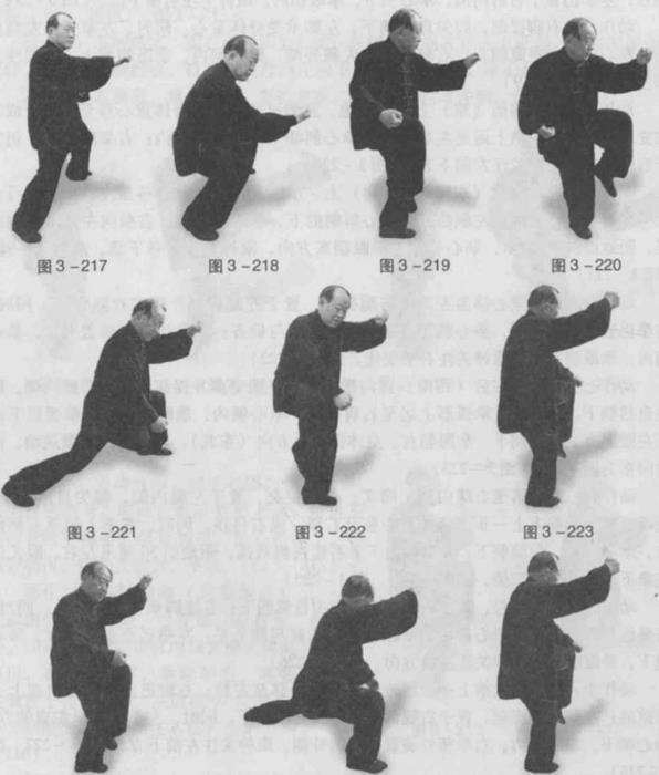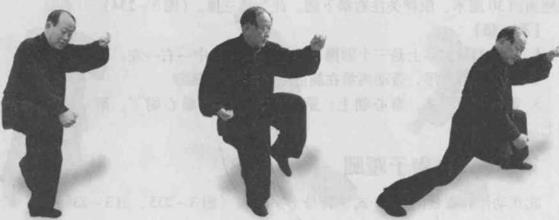 动作四右脚向前(东)上一步落地左脚迅速提起身体重心移至右腿,成右独立步。同时左拳上运至左肩前方拳心斜朝下拳眼斜朝内右拳略外旋仍置于右胯外侧。眼神关注左前下方。(图3-220)