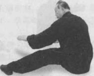 动作五左掌沿右臂内侧向下推(按)至左腿内侧掌心朝下掌指朝前右掌配合左掌下推而向上拉