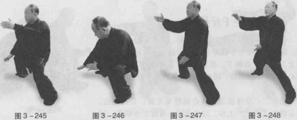 动作三松胯下腰身体下蹲同时两掌随身体下将往下(两脚内侧)按右掌掌心朝,掌指朝右前左掌做臂外旋掌心翻朝上,学指朝右。眼关注双掌变化。(3-242)