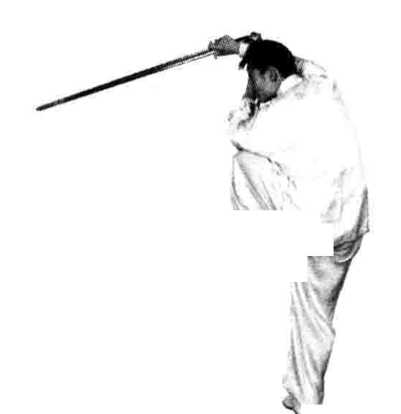 (2)右脚后撤。同时, 右手持剑经上向右后挂起,