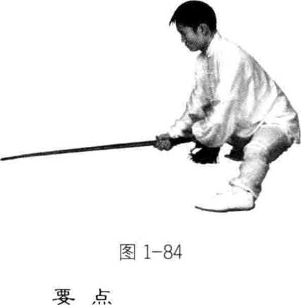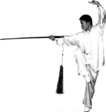 (2)重心移至左腿,直立,右腿屈膝提起。右手持 剑向前方平刺,手心向上,左手剑指上架至头左侧上方。 目视前方(图1-85)。