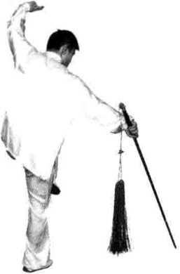 (5)右腿站立挺直,左腿屈膝提起。同时,右手持 剑向左前反手探刺,左剑指经下、后上架于头左侧上方, 手心向上,剑指向右。目视右下(图