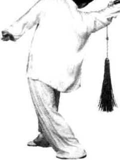 (1)左脚向前外摆上步,向右后拧魏转体。同时, 52 右臂外旋,左臂内旋。目视剑尖(图1-132)。