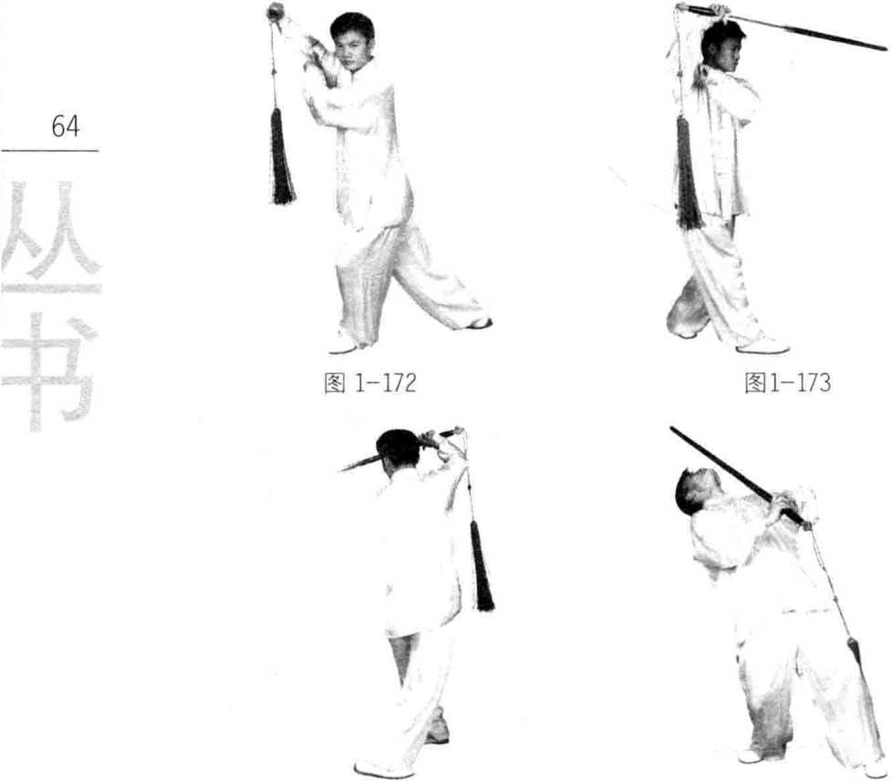 (1)左脚向左前落地外展,左前上右脚扣落,左前 上左脚外展落地,最后上右脚内扣(圆形步)。同时,右 臂内旋,从右向左云剑一周;左臂屈回,从右臂下向左 划弧。以右脚为轴,身体左后转(图1-172?图1-176)。