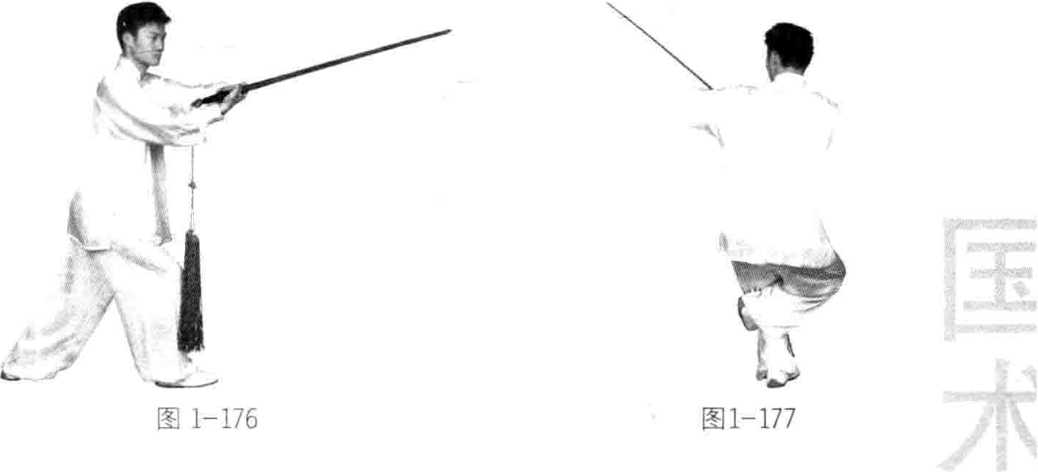 (2)身体左转,上左脚屈膝半蹲,右脚面扣在左膝 弯部°同时,剑向左前上截,左手附于右臂内侧。目视 剑尖(图1-177) o