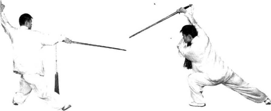 重心右移,成右弓步。同时,右臂外旋,剑从左向 右反劈,左手上架口眼看剑尖(图