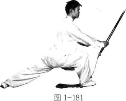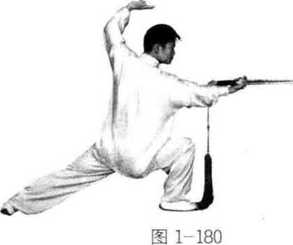 (2)而后上身向右后转,在成右弓步的同时,剑向 上崩,左手附于右小臂内侧。目视正前方(图1-181)。