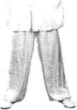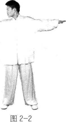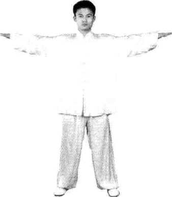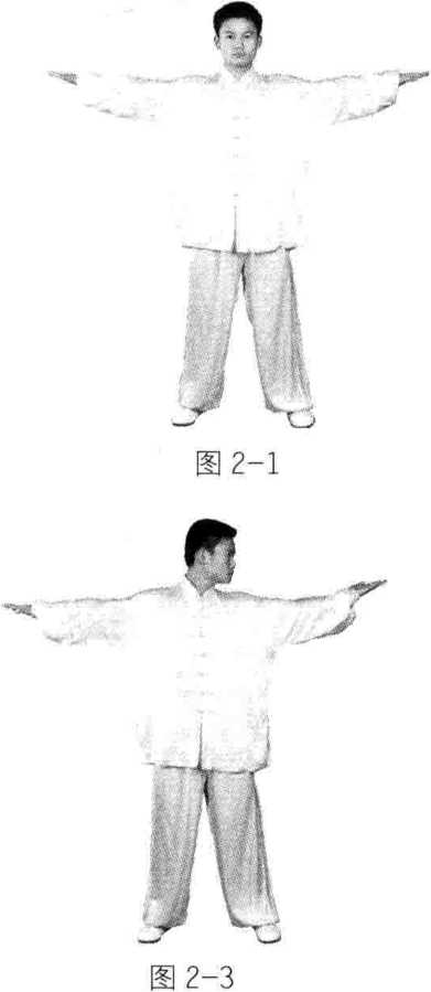 两腿左右开立,略宽于肩,两臂侧平举成一直线, 两手心向下。目视前方(图2-4)。