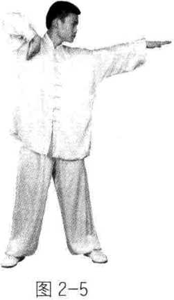 1 .右臂外旋至掌心向上,不停,臂微屈手指领先, 经上、向左、向下于胸前(图2-5)。
