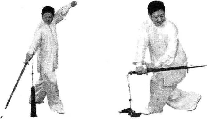 412412(2)右脚向左脚前上步里扣。同时,右臂内旋,剑 从上向左下穿;左手剑指经下、右提至右胸前,掌心向 左(图 2-158)。
