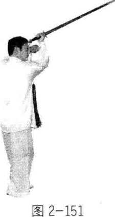 (1)(1)右脚向右侧前上步,脚外展落下,随即上扣左 脚。同时,右手持剑内旋挂至头前上, 剑尖向右,左剑指附于右腕。目视右前 方(图 2-151)。