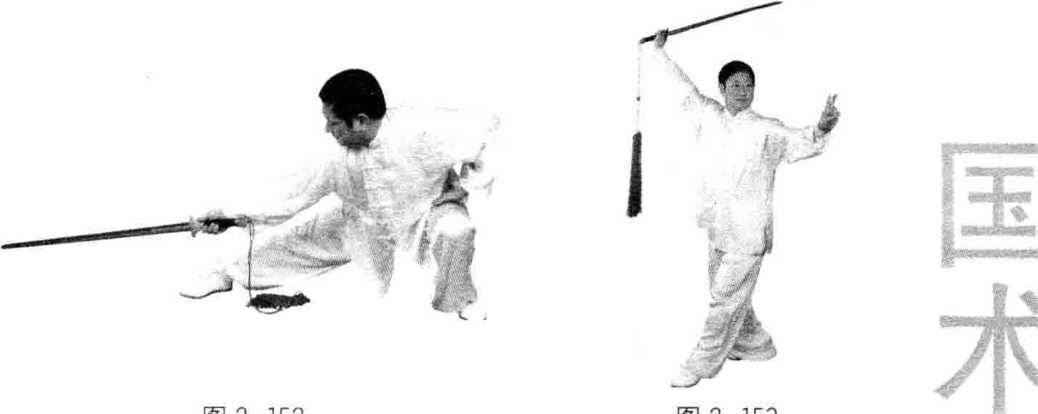 (1)左脚向左前摆步,上身抬起。右手持剑屈腕向 上挂起,剑尖向左;左手剑指贴背下穿出后,臂外旋向 左下方探出。目视左前方(图2-157)。