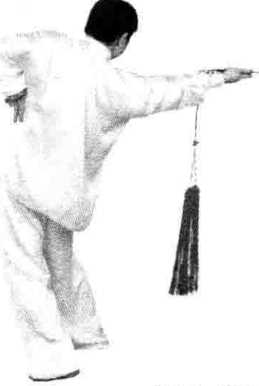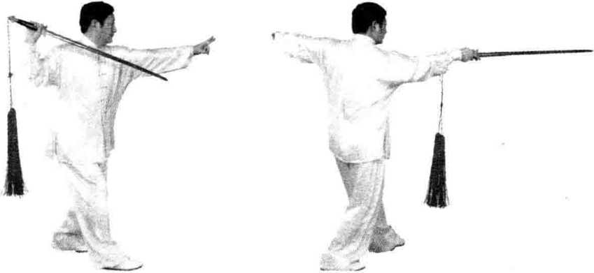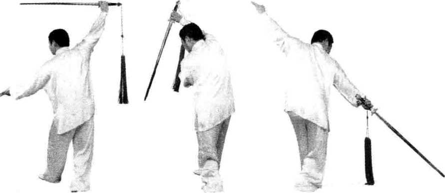 图 2-157 图 2-158 图 2-159图 2-157 图 2-158 图 2-159(3)左脚经右脚前向右扣落。右手持剑,反臂经右 腋下向右后穿刺;左臂外旋向左前上举伸,手心向上。 目视右后方(图2-159)。