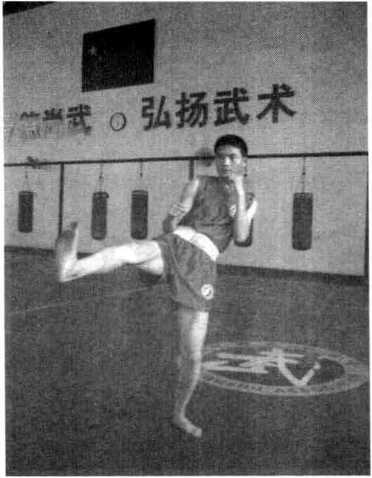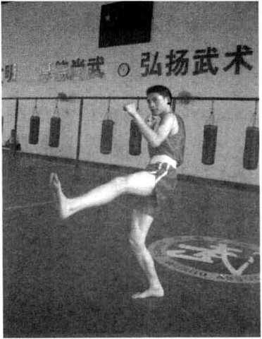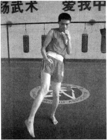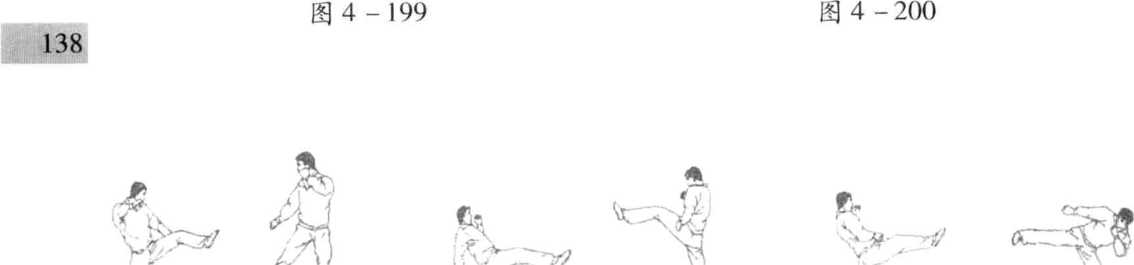 动作要点:提膝,送髓,踹击要连贯,两腿踹击交替要迅速。(图4-201;图4-