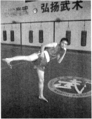 动作要点:鞭腿落地后,左腿迅速调整平衡,同时右腿迅速侧踹。(图4 - 203 ;