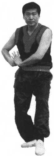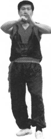 拆门解义:此吊马势属备战姿势,因左脚吊 起,可以随时打击对手;如对手用脚打击我下盘, 我即可起左脚,采用以脚破脚法来迎击对手。