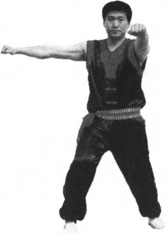 左拳向身前从下向上抽打,拳高与 下颗平,拳心向内,目视前方(见 图 94)。
