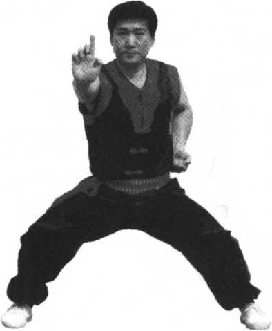 图解:依上势,右脚横后拖 一点,全身朝正南转正成四平大 马,身体稍向下坐。左掌变拳沉 肘收回腰间,右掌变一指掌沉肘 挑至右肩前方,目视右指前方 (见图93)。
