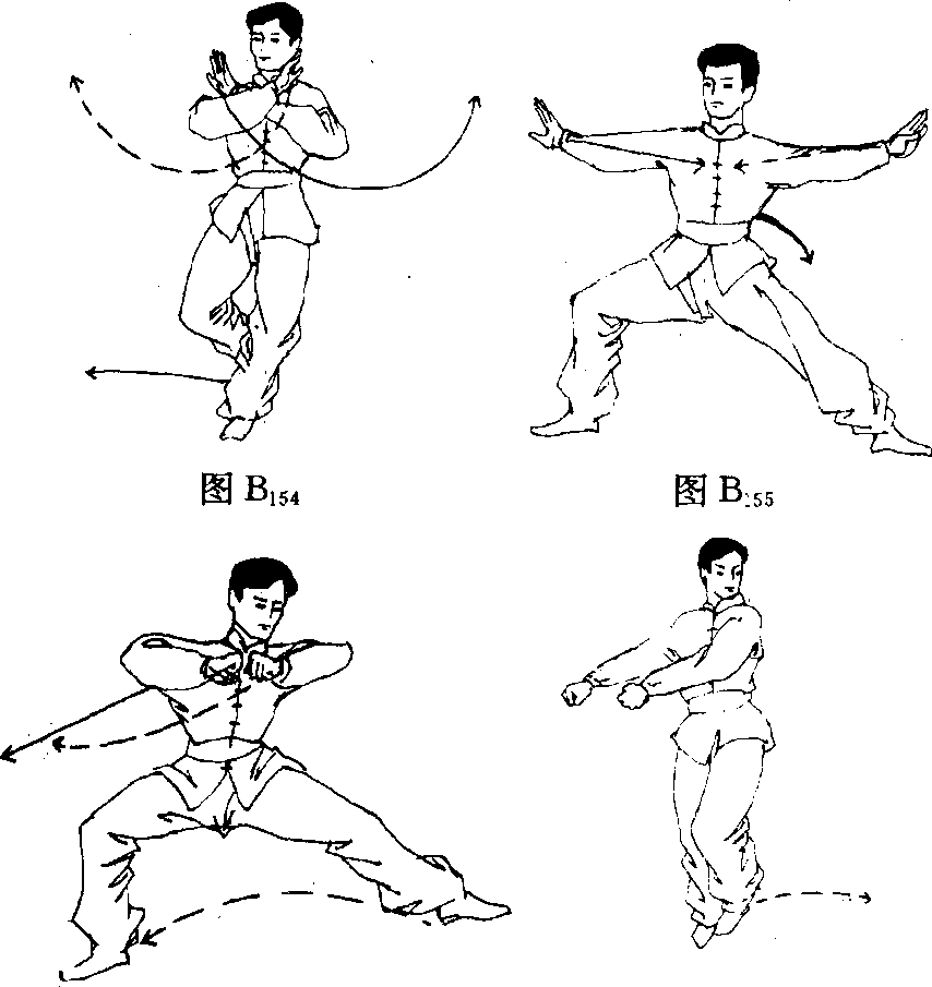 左膝后,同时身体右转,两手臂由侧向上、向内划弧交叉于 胸前,掌心向外,如图B154o (2)右脚向右横跨一步,成右弓 势,两手向下、向侧划弧,如图B炊。(3)接着两掌变拳,两 手臂向内平屈,拳面相对,成对心捶,身体向左侧屈,如图 Biss o