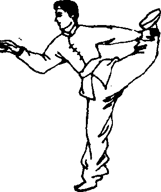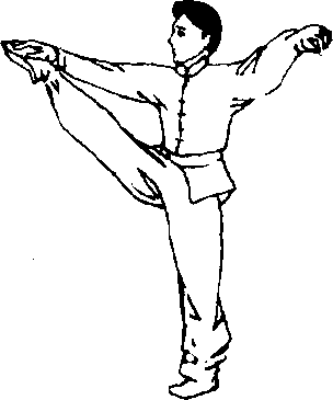 (5) 外开腿。①预备式:与正踢腿同。②动作要领:右 脚上半步,右腿直立支撑,左脚掌内扣,脚背绷直,向右侧 上方踢起,然后经上向左侧外摆,并以左脚背劈击右手掌,落