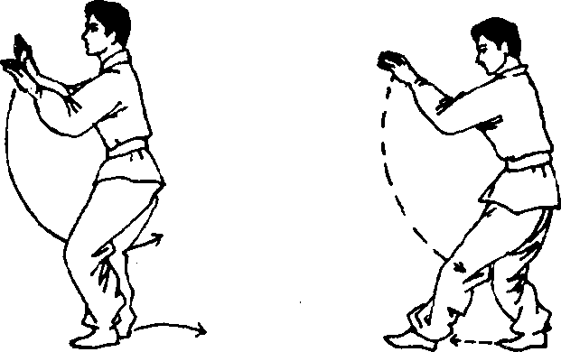 ①预备式: 与正踢腿同。②动作要领:右 脚上半步,右腿成支撑,左腿 伸直,左脚掌勾起内扣,经左 侧向上,向右成扇形踢起劈 击右手掌;然后落地同右脚 并拢,接着左脚上半步做右 里合腿,如图A2Z"③练习 方法:按口令一拍一动,做行 进间连续左右里合腿。做两 组,每组10—12次。