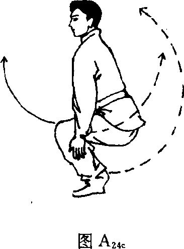(7) 图 A23b图 A23b图 A24a图 A24a图 A24b图 A24b后撩腿。①预备式:背向前方蹲立,两脚并拢,两 臂微曲,两手成立掌交叉于胸前,如图A24a°②动作要领:右 脚后退一步,左脚前脚掌蹬地,与右脚并拢并成蹲立,接着 右手臂向前摆起,左臂由下向后上方摆起,同时右腿用力蹬 直,上体挺起抬头,左腿向后上方撩起,目视左脚;接着左 脚向后落地,换做右撩脚,如图A24
