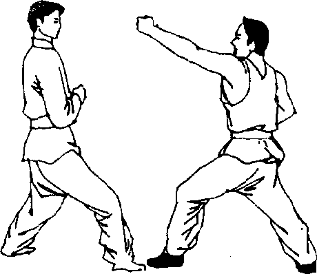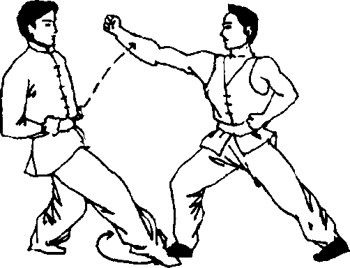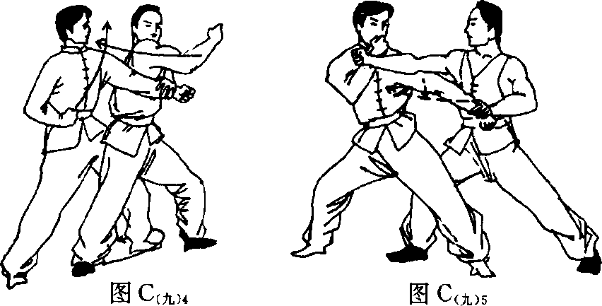拳收于右腰间,左手臂由 下从内、向后、向上、向前 抡起,以拳背劈砸乙脸,如 图G九〉8;乙以右手抓住甲 左手上臂向上推起防拳。 上动不停,并以右小臂贴 住甲左上臂,肘尖抵住甲 左腋前推,使甲身体后仰, 如图C (九)3a、b o