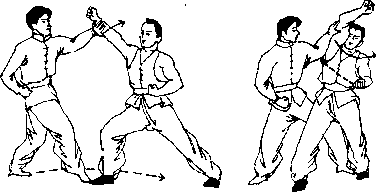 向左挥摆,化解乙的推臂,并以左手从右腋下抓住乙左.手腕 部,同时右脚摘出绕到乙左脚后,如图成九)”接着甲以,右拳