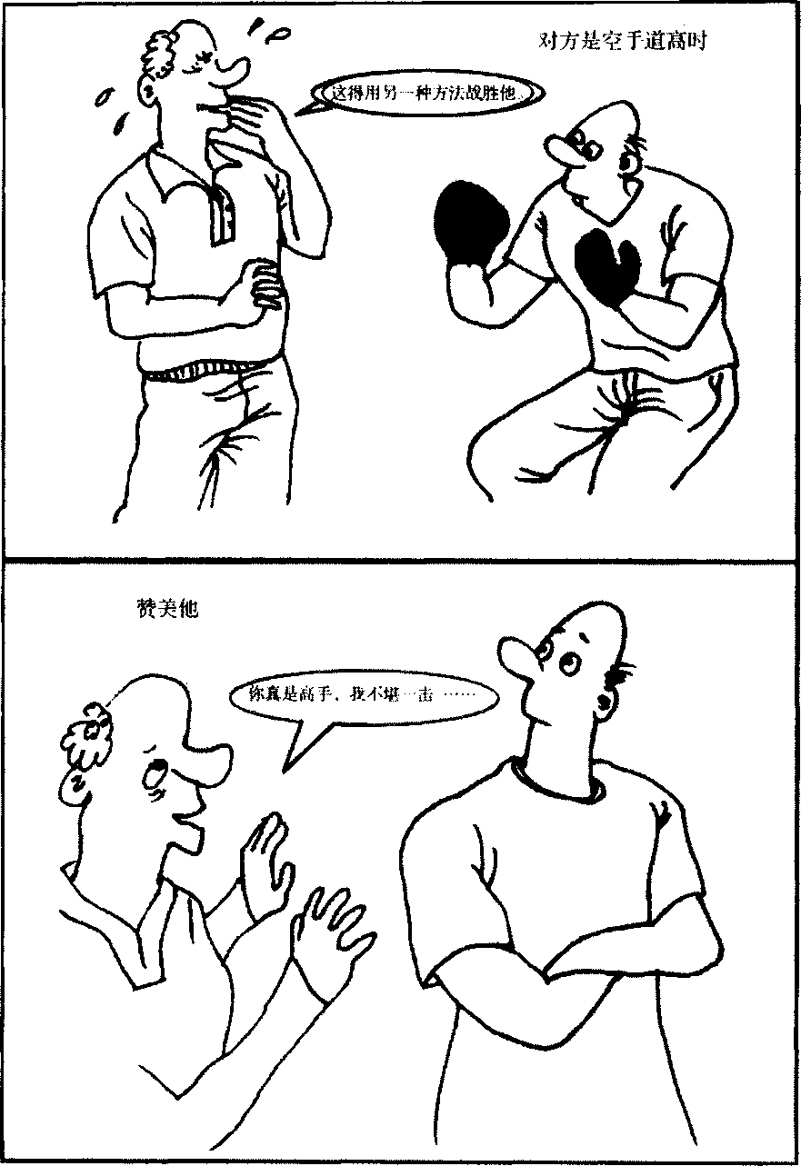 那么万一和空手道上段者碰上时就只有靠言语技巧来防御自己了。要记住真正对空手道有本事的人是极少去欺负弱者的。你可以这样说你如果是高手和像我这样的外行人打架岂不是贬低身价吗?如此技巧的赞美他使对方觉得我是强者所以不应该欺负弱者那你就可不战而保卫住自己了。