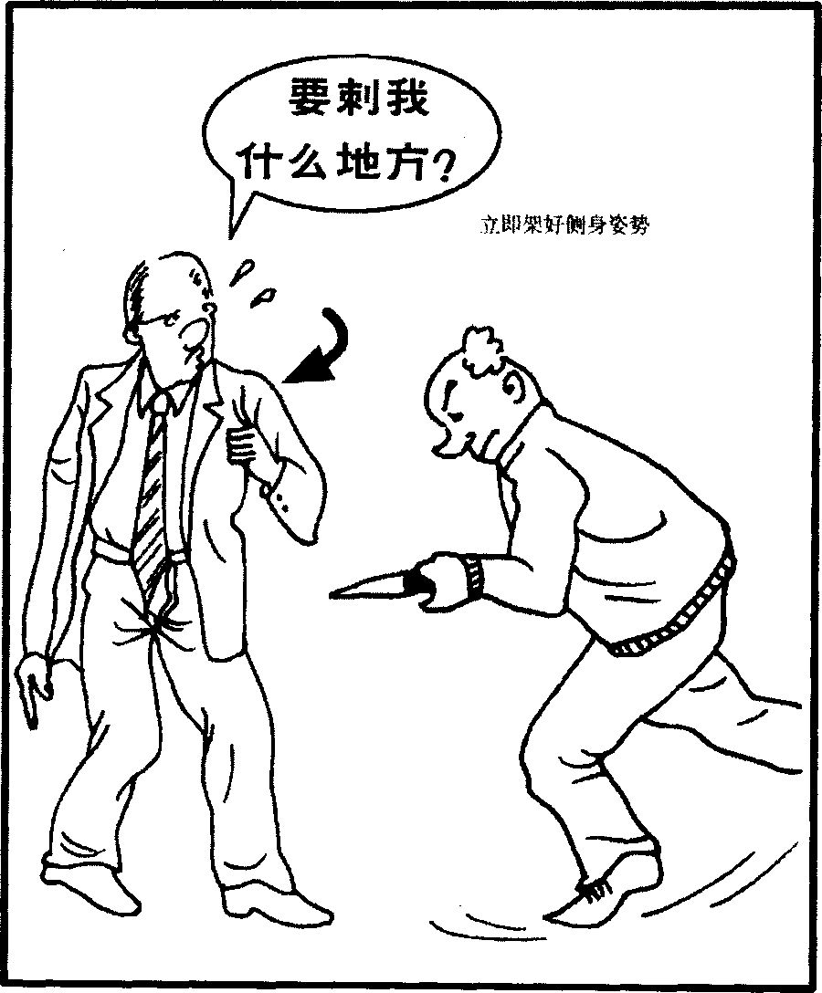 面对这情景你当然是迅速逃走最好。但是若已经在近距离相对而没有逃走机会时无论如何请你先做侧身的架势。如果采取侧架势面对暴徒的面积会减少因此被刺中的概率也跟着降低即使被击中也不会负致命伤。