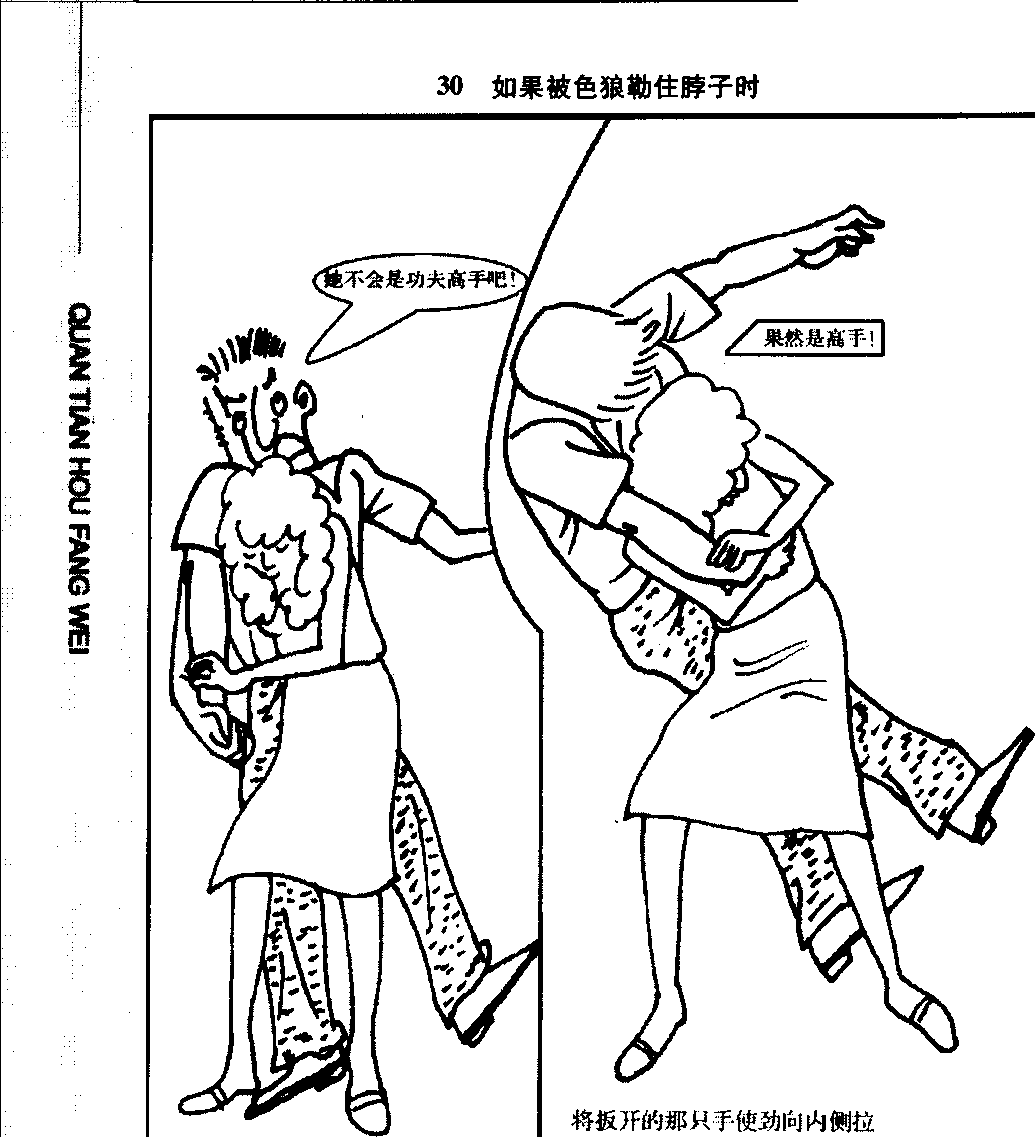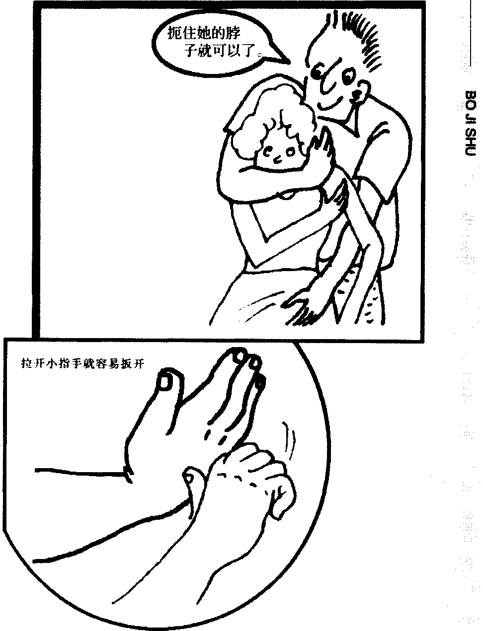 提示脖子被扼住时收紧领部是防止被勒的第一个要诀。然后先拉开色狼的小指。