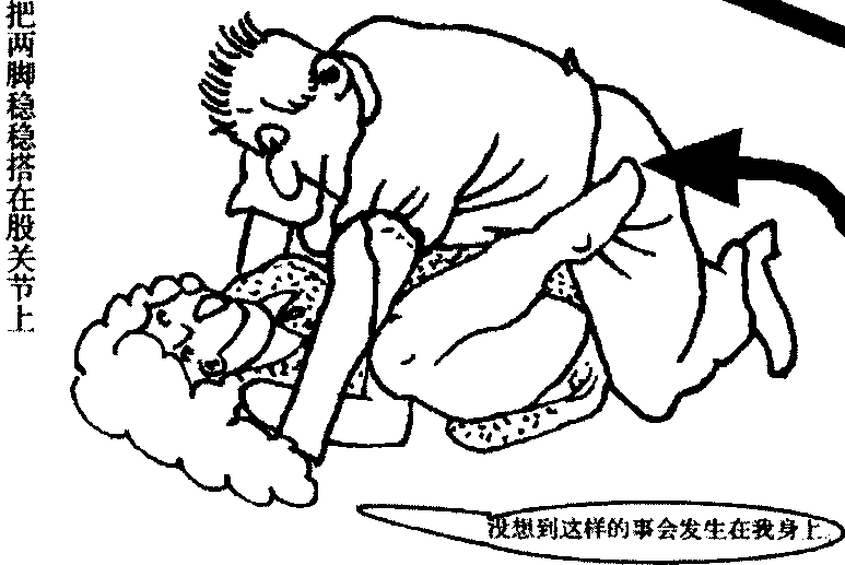 如果男性要强行侵犯女性,他一定会将自己的身体推进女性的两脚之间那是他攻击的目标而其手会置于女性胸口或脖子一带。此时你只要轻轻压住色狼的手腕将脚底稳稳男性的股关节上然后使劲伸直两脚。因为色狼的手腕被压住男性会像被汽车辗扁的青蛙般长长地伏在地上。因为情势危急所以女性可毫不容情地反击不过一定要把脚底搁于对方的股关节上。因为若是搁于大腿一带脚会滑落。