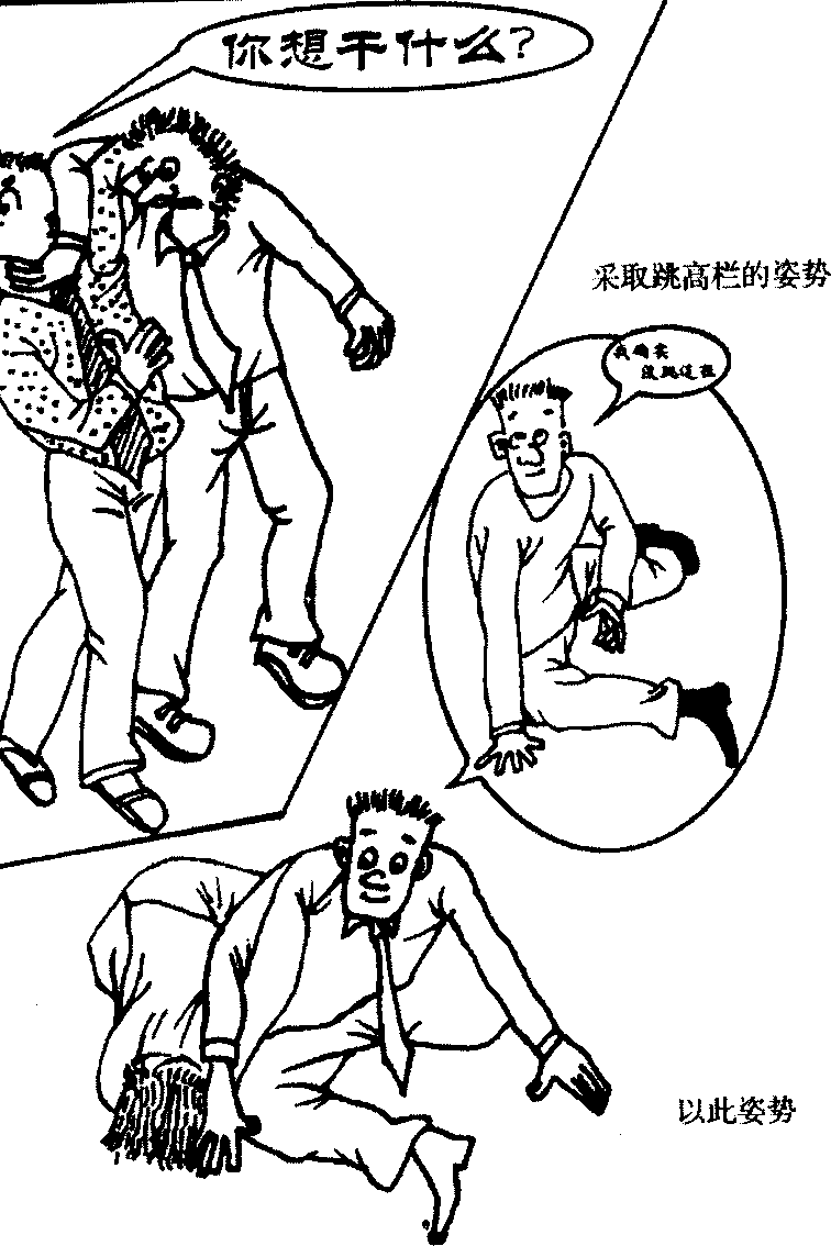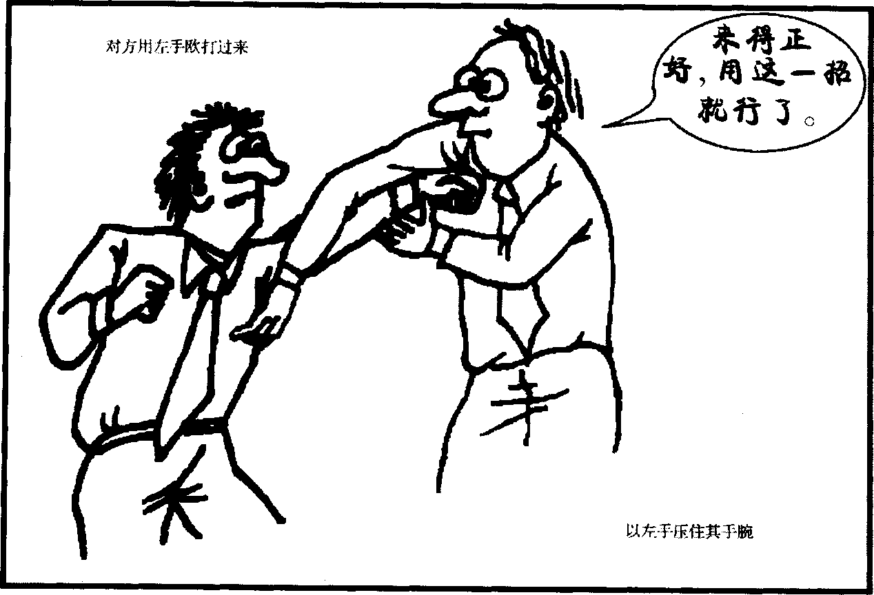 如果殴打过来的对方手臂收回慢当他要打出第二拳时你就有充裕的时间以侧身做迎击的准备。而只要你做好迎击的架式第二拳飞过来时便是你反击的机会。如果对方用左手挥出你则以左手轻压住对方的手腕然后用右臂卷进攻击你的这条手臂并把全身的重量加在对方的肩关节上。这时你一面将自己卷进去的手臂伸到对方脸颊处用手掌将其脸部往外侧推一面采取跳高栏的脚部要领坐下去。对方一定会拼命叫痛而投降。如果对方是以右手出拳则可用左手压住其手腕并以右手卷进该手臂。