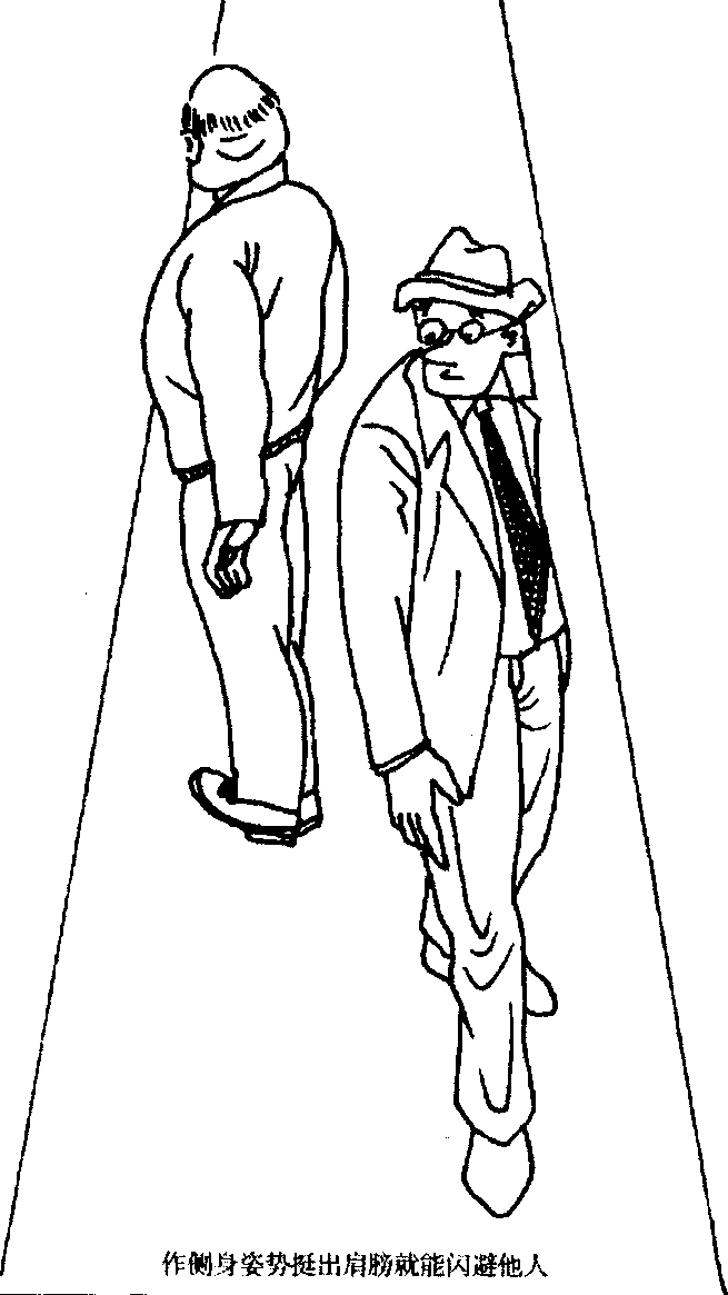 提示作侧身的姿势轻快地向前跳跃急速奔走而不碰到他人的肩膀。