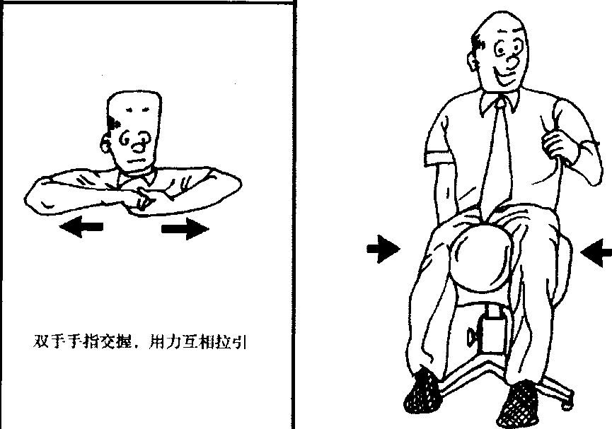 用这种方法进行燧炼可助你胁下的肌肉更为结实当然手臂的肌肉也会增强所以它可说是一种很好的肌肉锻炼法。此外还有许多日常能够轻易做到的肌肉锻炼法。以拜佛合十的手势合拢双掌在手腕一带使劲互推或张开两肘使双手手指交握然后互相拉引等锻炼每天只要各做10至20秒种就有很好的效果。在两膝间夹住球的练习对于增强脚的肌力也很有帮助。你不妨立刻实行效果会让你感到吃惊。
