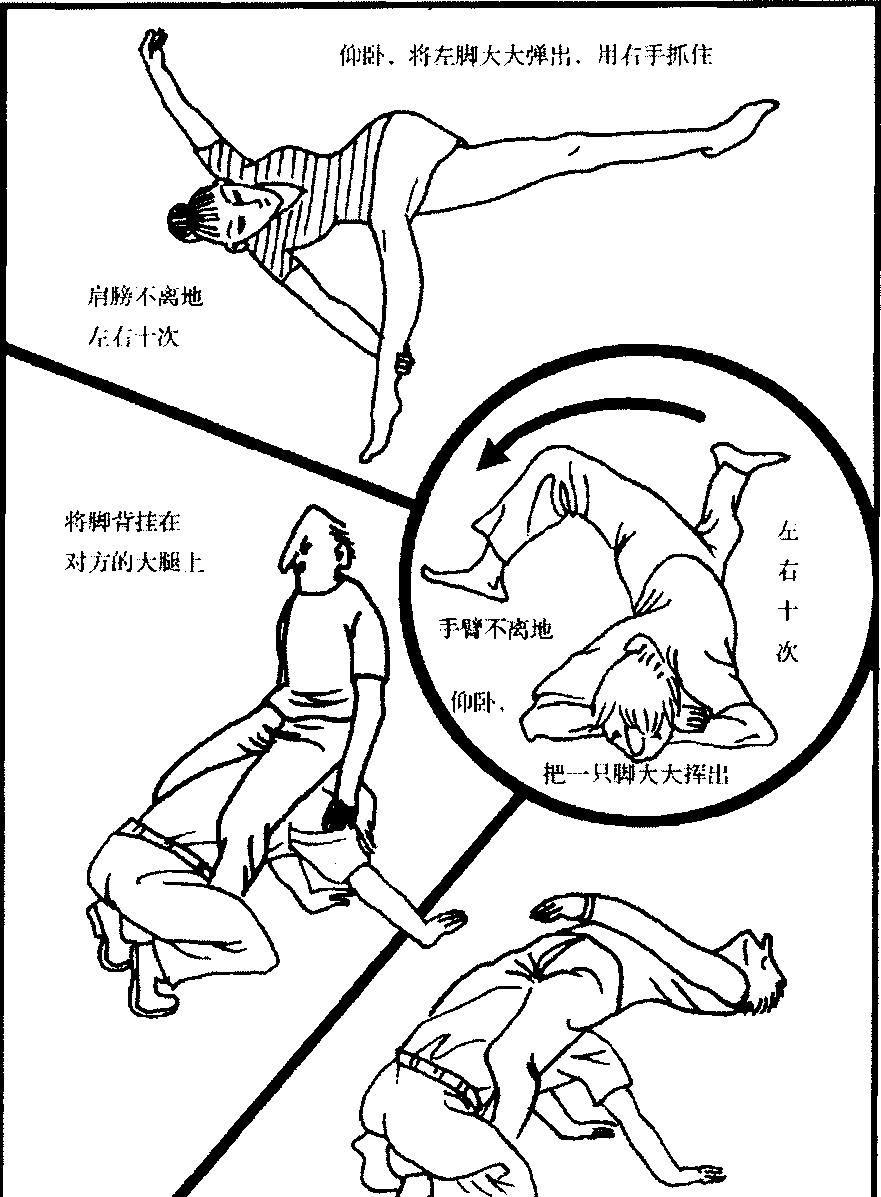 另一种是俯卧将右脚向左边挥出使其脚尖在身体左边尽量远的地方着地。然后换边做同样的动作只要左右交互做10次就有确实的效果。要领是上半身绝不可离地眼睛盯向着地的脚这种扭转身体的感觉非常舒适。有人认为做了这二种预备体操就可进入比赛但若能再加上二人一组(一人为马)的腹肌运动就更万无一失了这动作也需每天做0次。这些体操毫无疑问的能强化腹肌使其经得住打击同时更是女性消除腹部赘肉的良方。