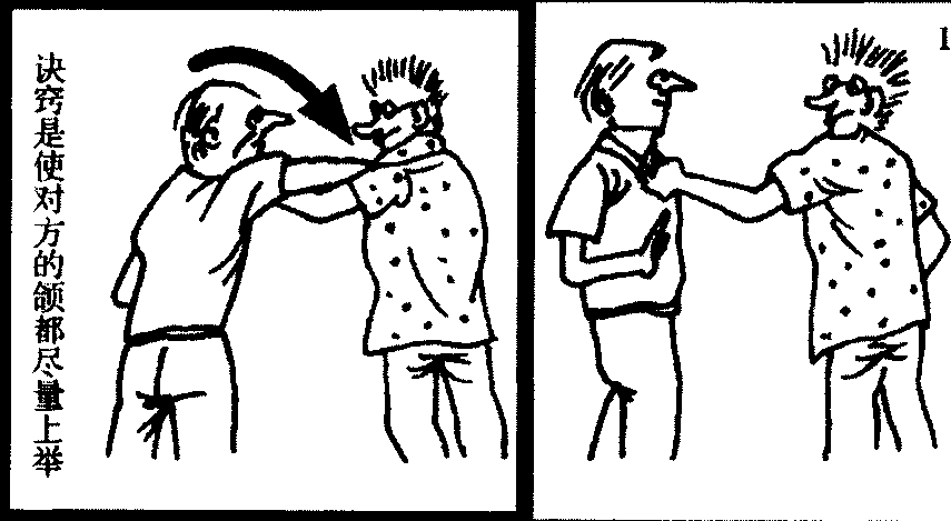 人类的额部较一般人的想象更为脆弱不需很大的力气就能轻易地将之别向一侧。这一点乃是自我防卫术的基本招式请你务必记住。另外也是你在攻击他人颗部时需牢记的一点即颗部在由下往上攻击时相当脆弱这在摔角或相扑的影片里可以明了如果咽喉被制止住且颗部被推上时就完全失去了抵抗的能力而告败北。所以当对方伸手抓向你的胸口时即刻侧身令其手臂伸直然后以自由式泳法的手势胁制对方的手臂再顺势仰推其脸部你只要这样做就能任意地把对方向前或向后推倒。或者用手掌推对方的咽喉使其颗部向上抬侧往一边并用脚尖固定对手的脚跟抓住他的裤带向后拉。这个动作可以充分地保卫你自己。