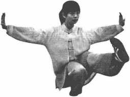 7 .前举腿低势平衡:身体直立。一腿屈膝全蹲支撑;另一腿 挺膝伸直,勾脚前蹬,脚尖向上,体前平举(屈蹲腿大腿面成水平 或低于水平,前举腿成水平或高于水平。身体保持平衡,上体不能 晃动)。(图4-22)