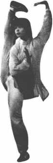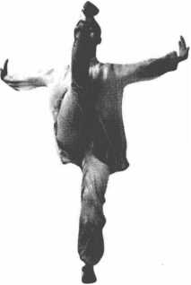 1.正踢:一腿伸膝直立,另一腿向体前直膝勾脚上踢,两腿 膝盖伸直,踢摆腿的脚尖触及额头。(图4-23)