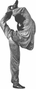 盖伸直,踢摆腿的脚底触及头顶,两手触碰踢摆脚。(图4-25)
