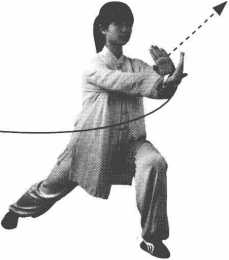 ①接上势,身体重心保持不变,上体微右转,双脚不动。同 时,左手上举至左耳旁,两掌心向前。头向右转,目视前方。(图 6-10)