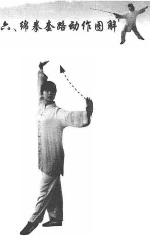 ②身体直立,重心上升, 上体微向左转。左脚提起,收 腿并拢经右腿向身前落步,脚 尖着地,成左高虚步,右腿伸 膝直立。同时,左臂向左侧摆 至肩高,左手立掌,掌心向外; 右臂向右上方摆至右耳旁,右 手亮掌,掌心向上。头向左摆, 目平视左前方。(图6-9)