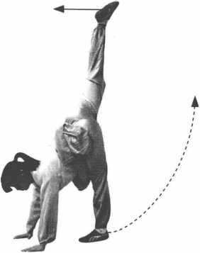 ②身体重心前移,上体前屈俯身。左腿支撑,右腿向体后由下 向上踢摆。同时,两臂随屈体向下直臂摆动,两掌落于左脚前方,