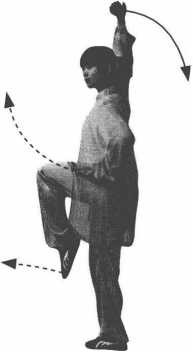 要点:提膝时,身体直立上顶,平衡稳固;亮掌手腕用力上托。