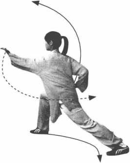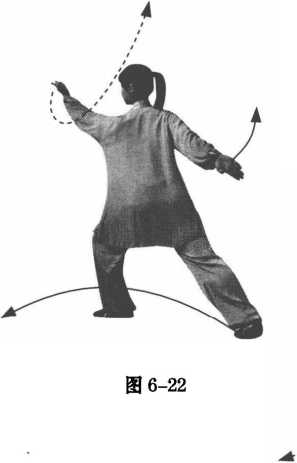 ③左脚经右脚内侧向左前方弧形上步,脚尖微外展,身体重心 前移落于左腿。上肢动作保持不变。目平视右前方。(图6-24)