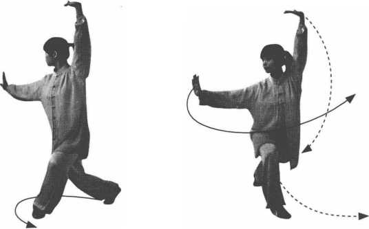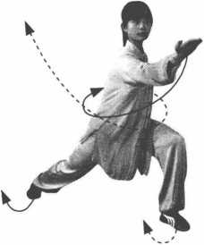 ②身体重心右移,上体右转。左脚蹬拧,右脚外摆,右腿屈膝 前弓,成右弓步。同时,左臂随转体伸出向右平摆到右前方,高与