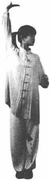 ②身体直立,微向右转。左脚离地,左腿屈膝提膝;右腿直 膝,独立支撑。同时,左手变掌,屈肘抱于左腰侧,掌心向上;右 手亮掌,右臂直臂上举于右耳旁。头向左摆,目平视左前方。(图 6-21)
